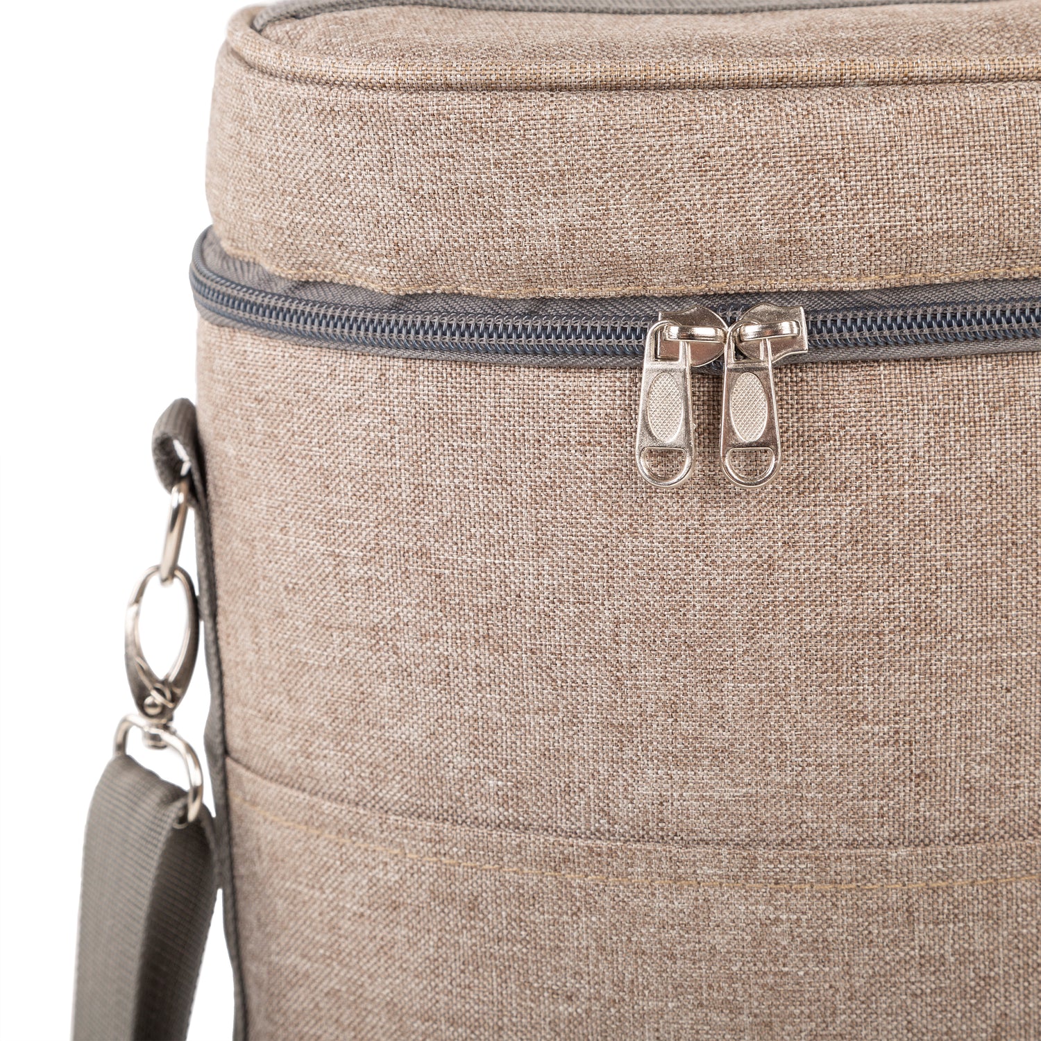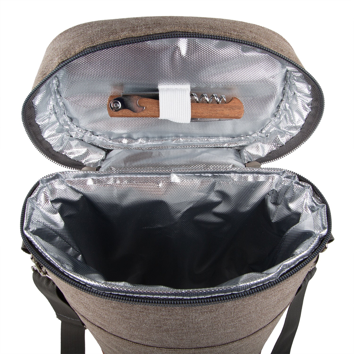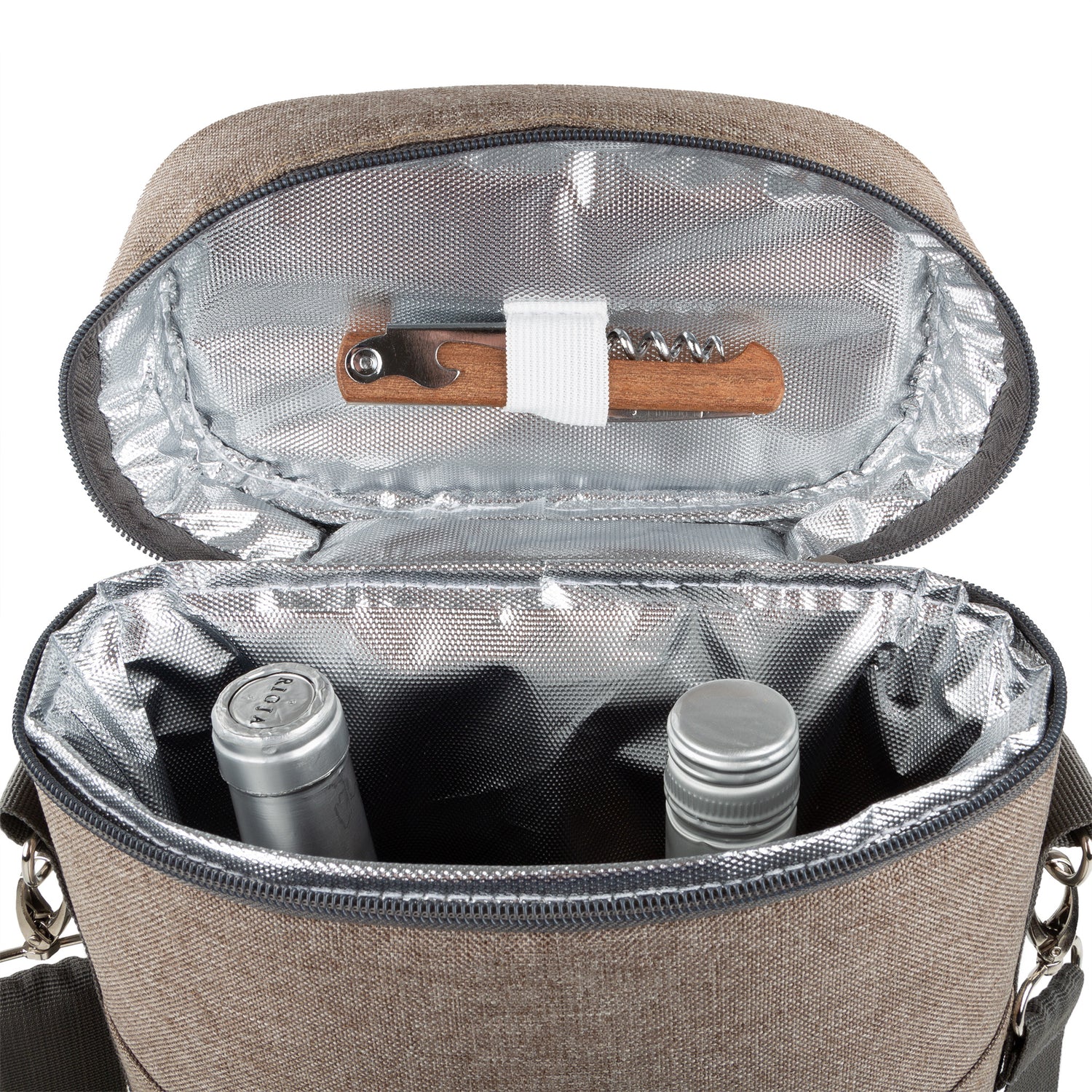 Inside there is space to accommodate up to either 2 drinks bottles or 1 bottle and 2 plastic wine glasses (sold separately) and is lined with premium heat resistant insulating materials that can keep your drinks chilled for up to 7 hours.
