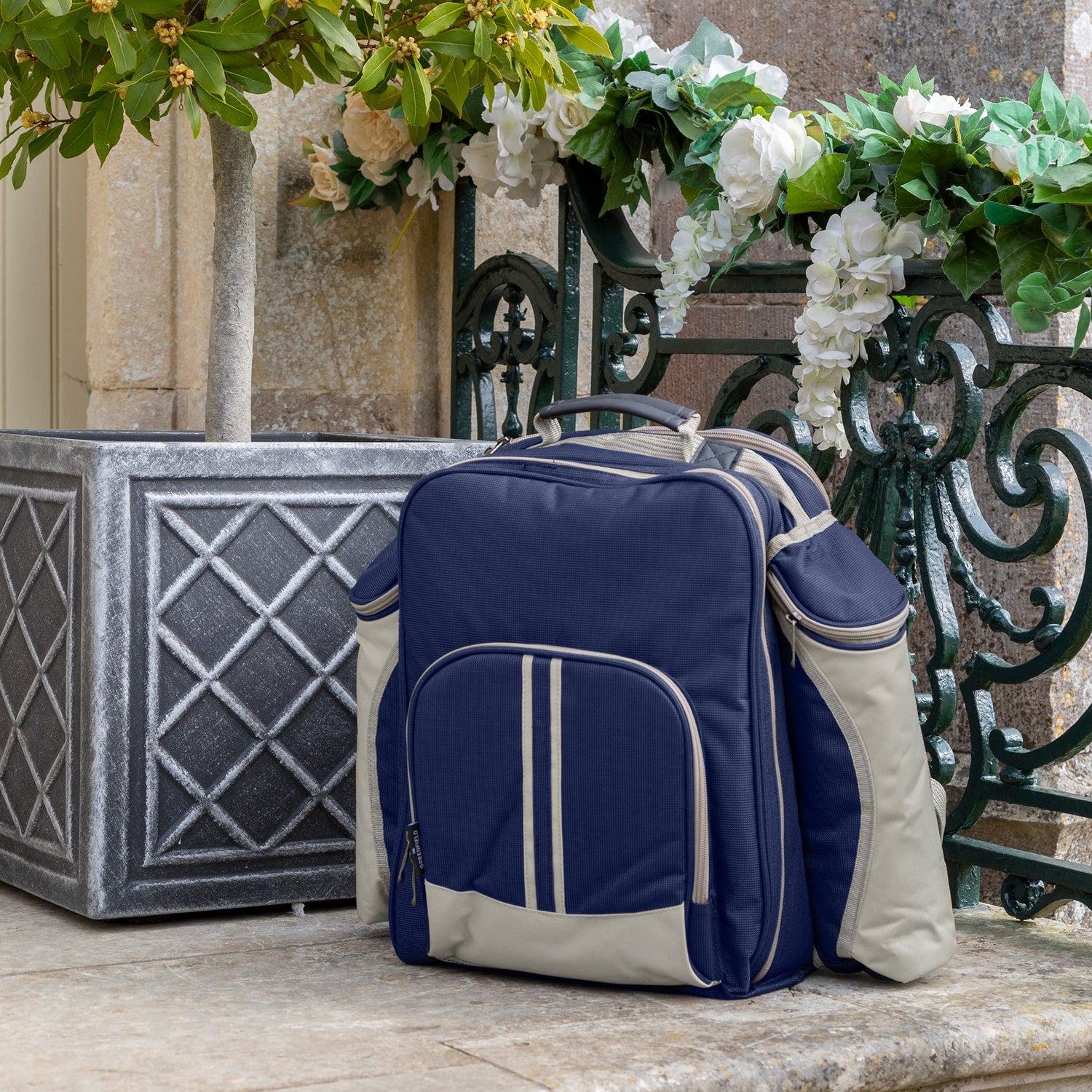 The practical design includes a pocket on the front of the backpack which is ideal for holding smaller items such as keys and a mobile phone. Concealed within this pocket are two integrated webbing straps for attaching one of our picnic blankets.