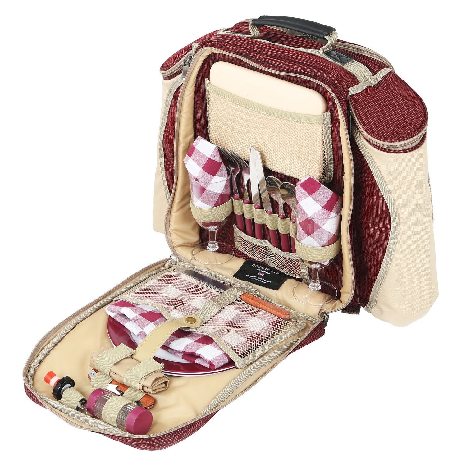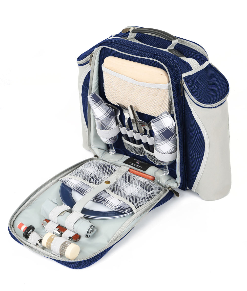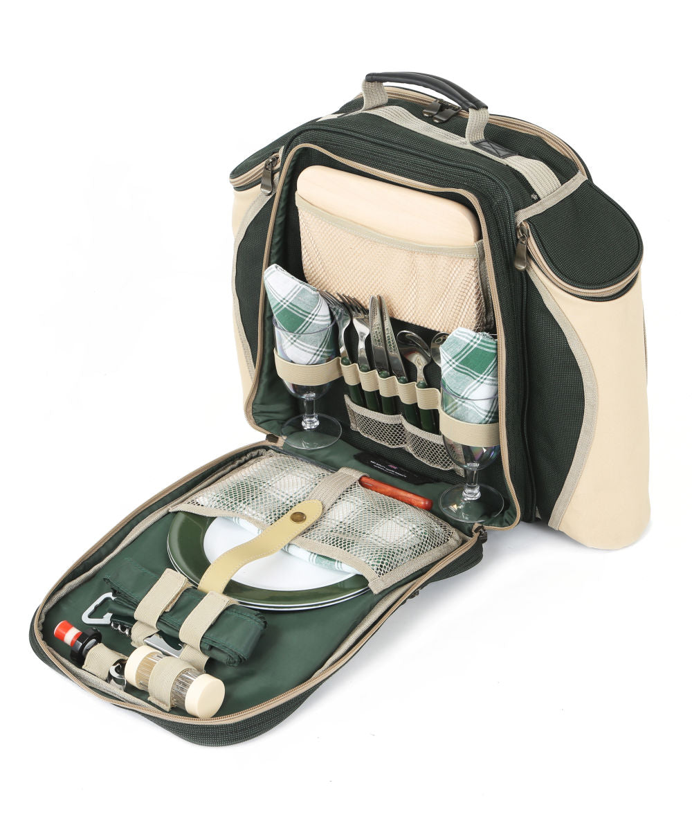 The picnic accessories are secured within the front compartment with straps and elasticated holders.