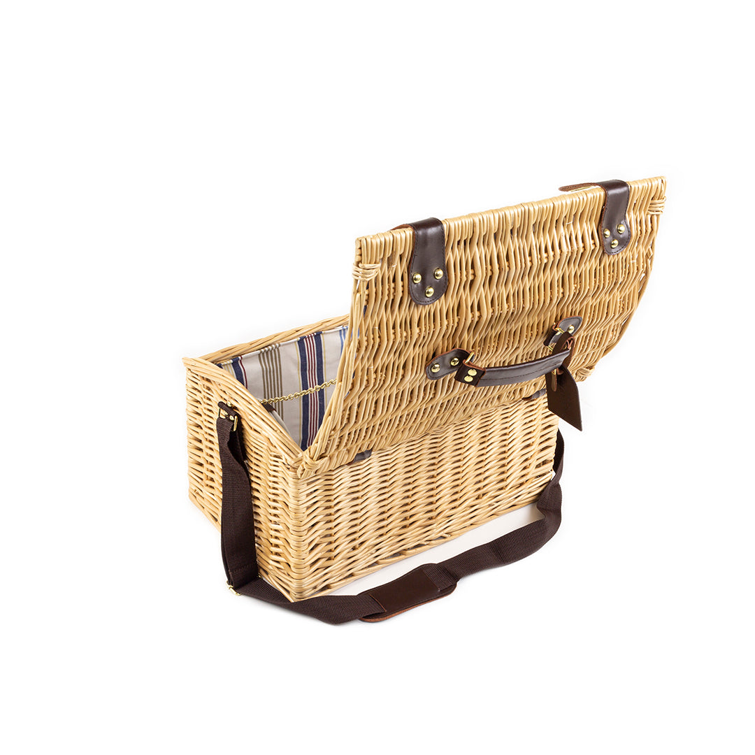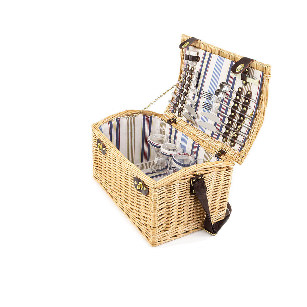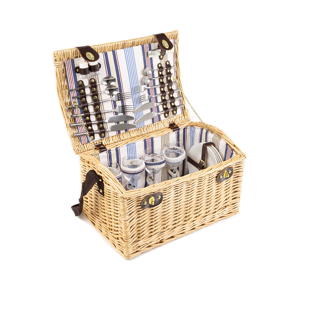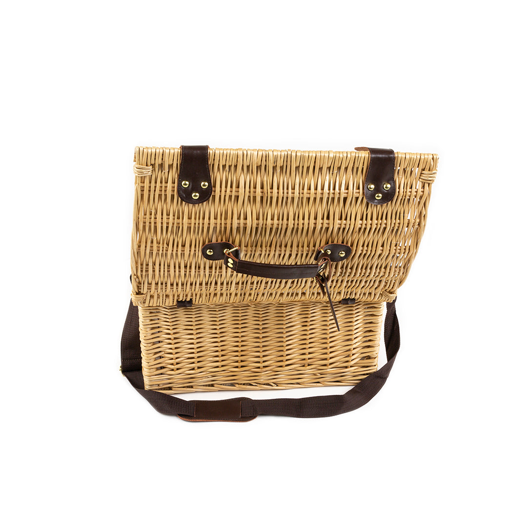 Picnic in style with this luxury fitted hamper for up to four people. This picnic hamper has been lovingly crafted from the finest full buff willow, making it robust, yet lightweight. Chestnut brown leather accents and polished gold coloured metal hardware are the perfect finishing touches to this classic hamper.