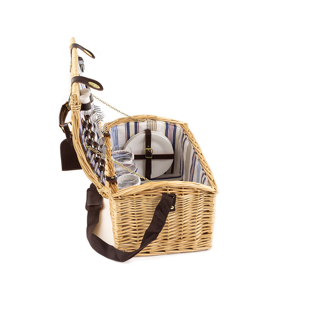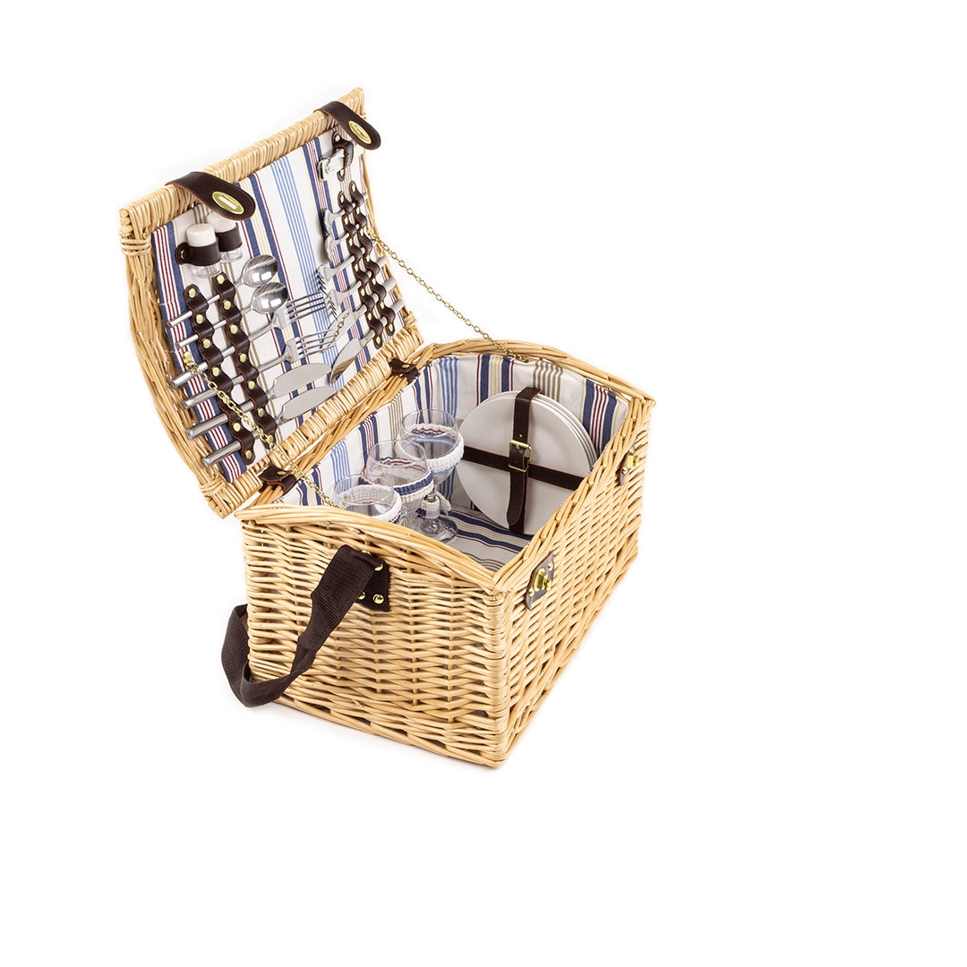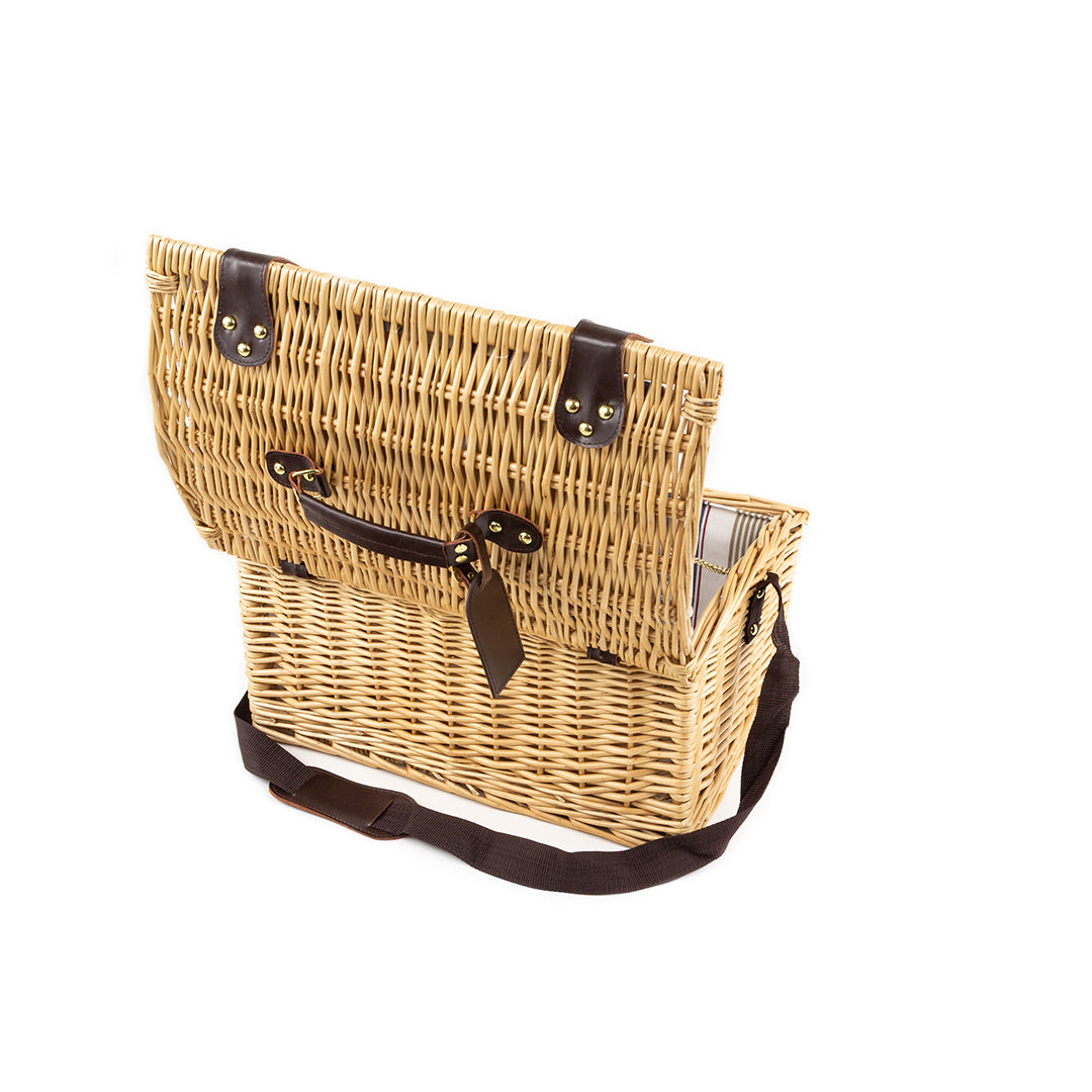 Picnic in style with this luxury fitted hamper for up to four people. This picnic hamper has been lovingly crafted from the finest full buff willow, making it robust, yet lightweight. Chestnut brown leather accents and polished gold coloured metal hardware are the perfect finishing touches to this classic hamper.