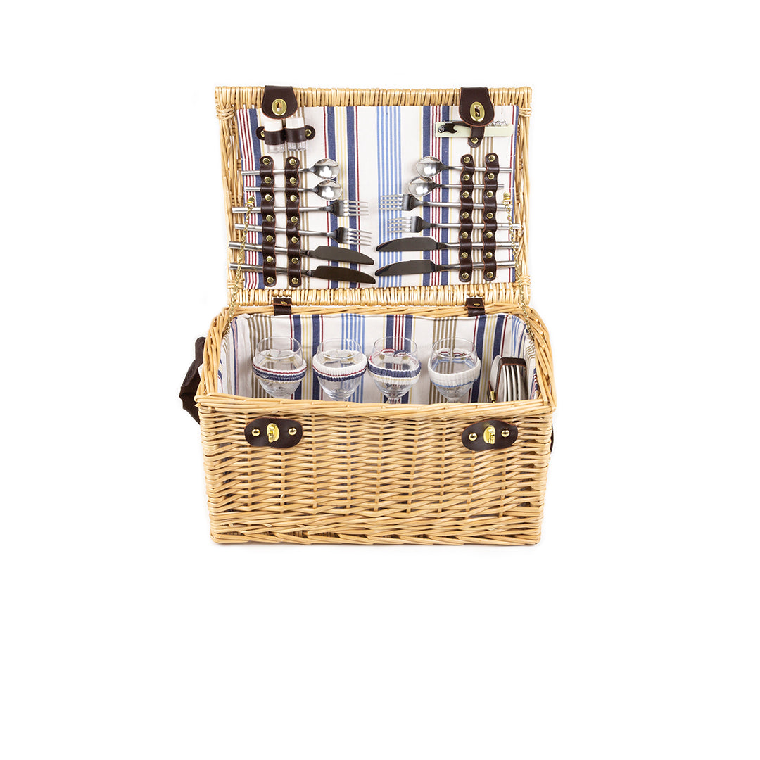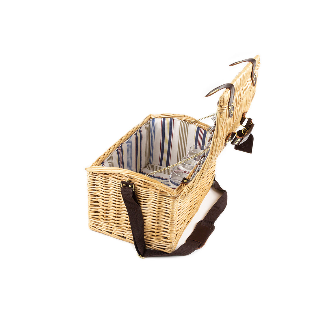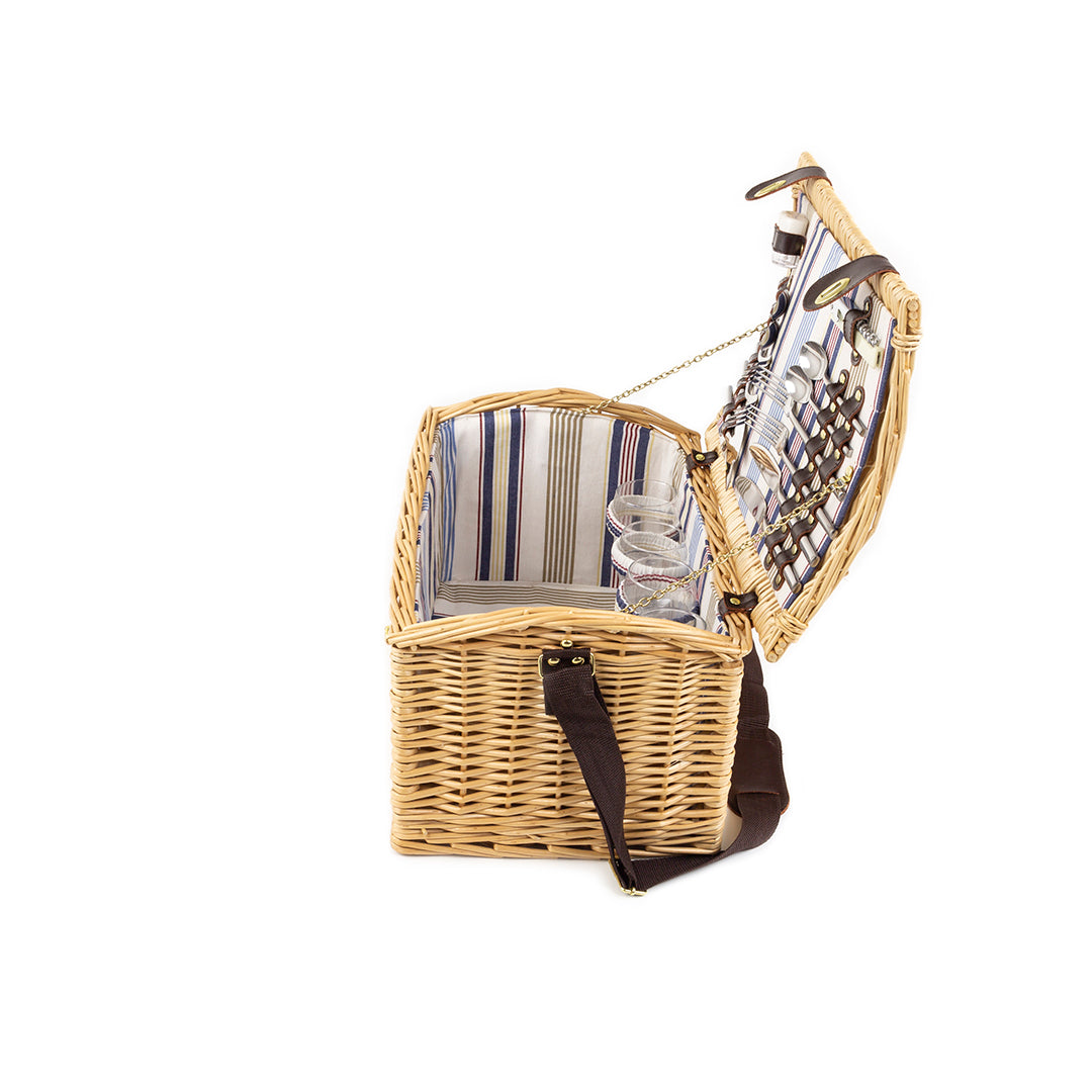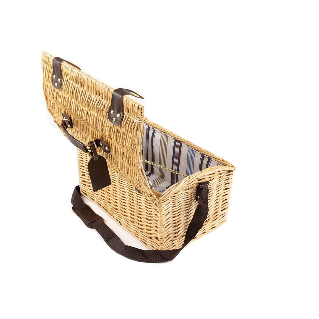 Picnic in style with this luxury fitted hamper for up to four people. This picnic hamper has been lovingly crafted from the finest full buff willow, making it robust, yet lightweight. Chestnut brown leather accents and polished gold coloured metal hardware are the perfect finishing touches to this classic hamper.
