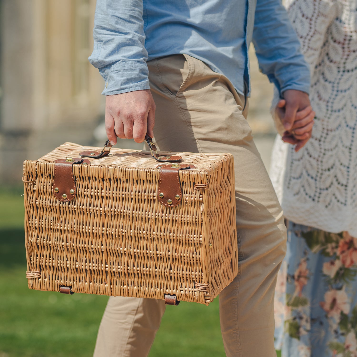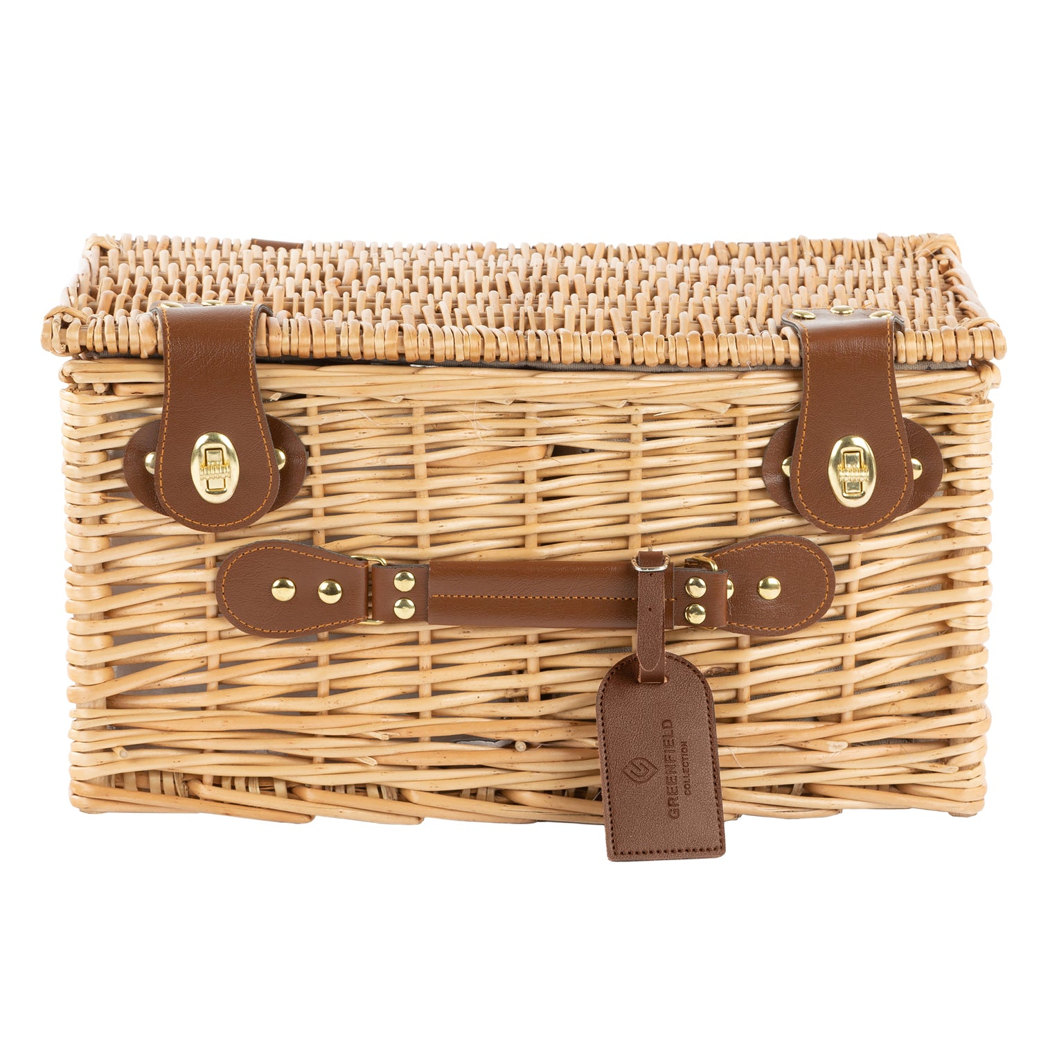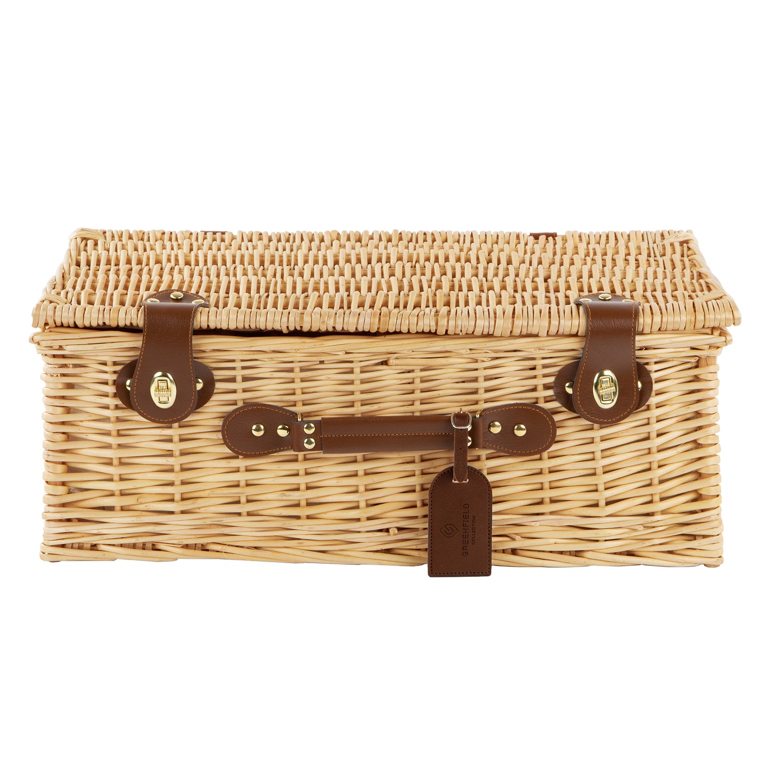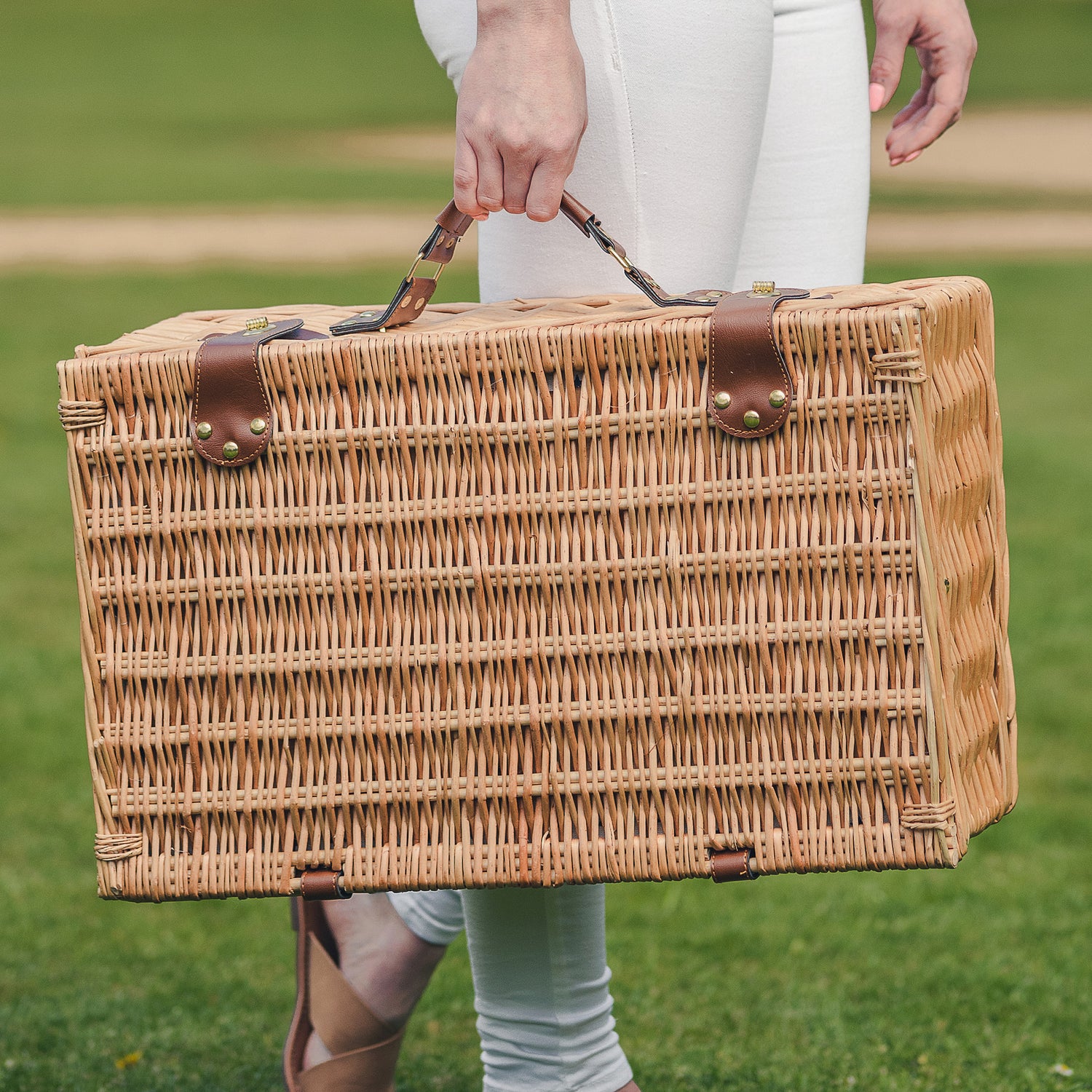 The tan colour faux leather carry handle and gold fixings adds a touch of class to this beautiful hamper and makes it effortless to carry your picnic to wherever you wish to enjoy an alfresco dining experience.