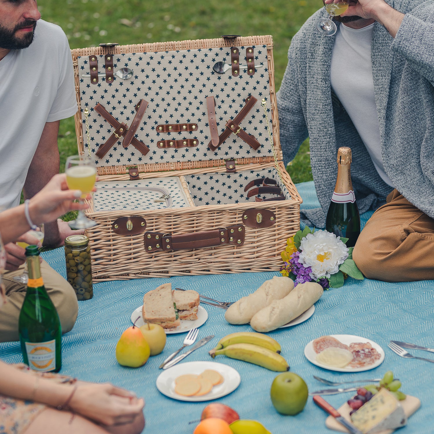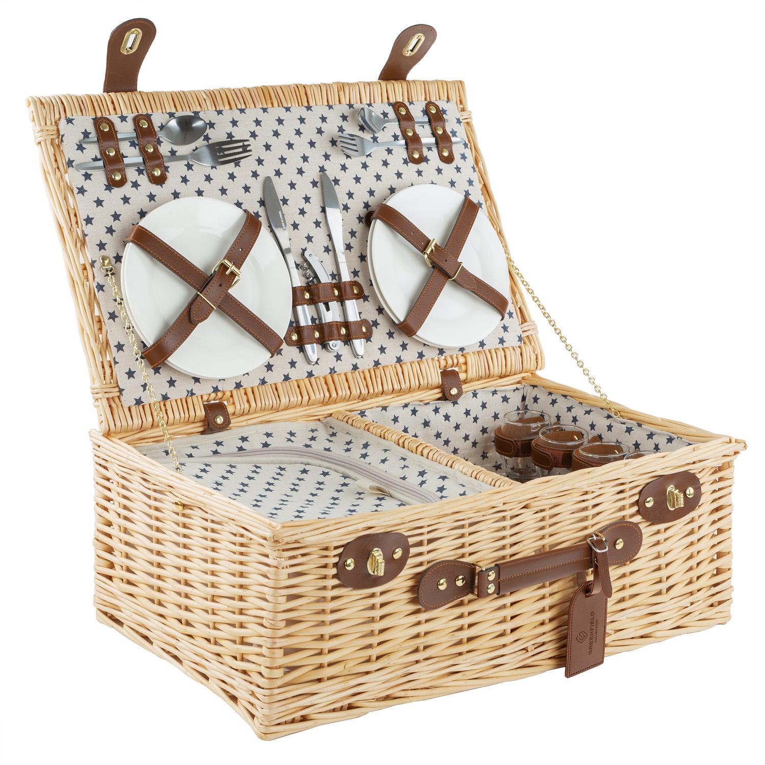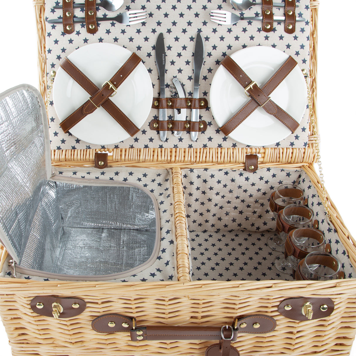 This luxury wicker picnic basket oozes style and features a vintage inspired design with natural fabric lining and navy star print.