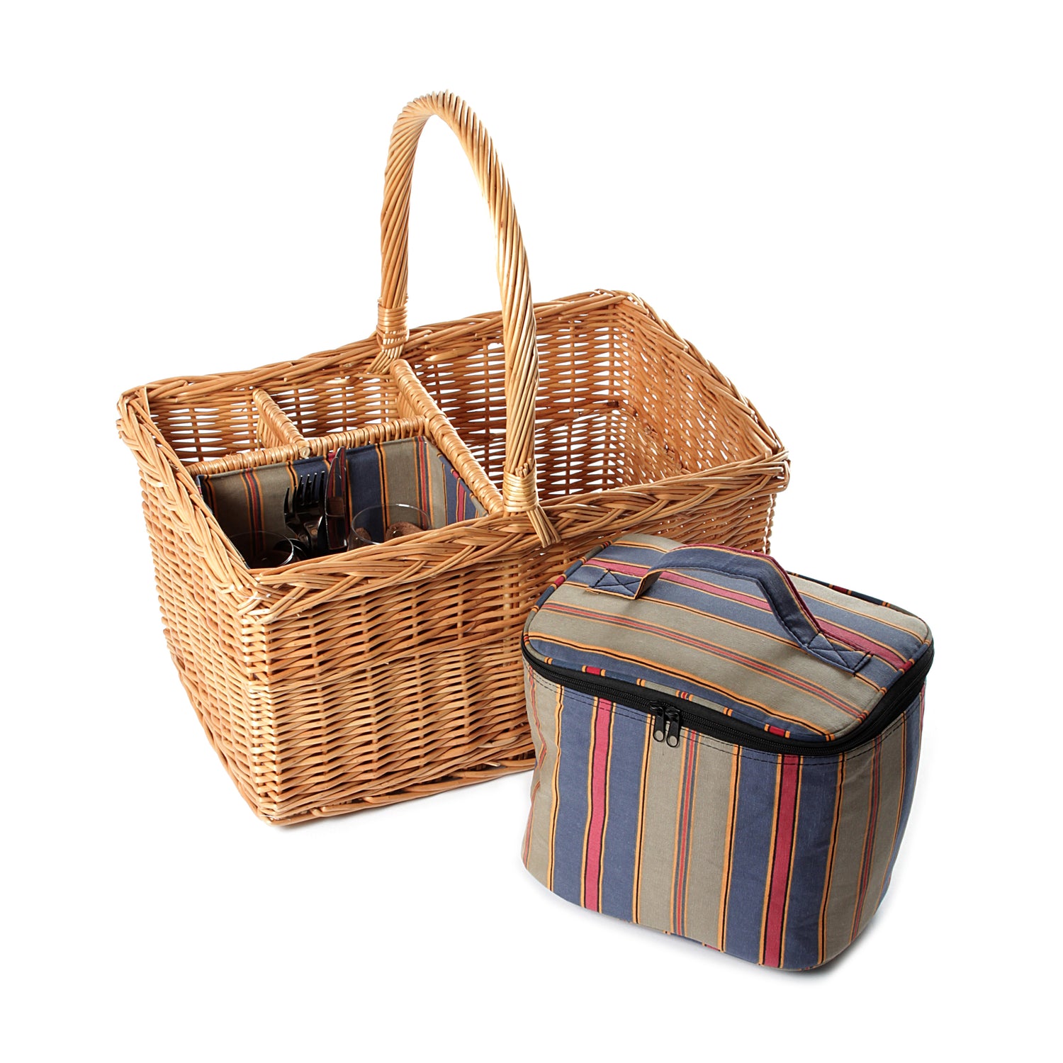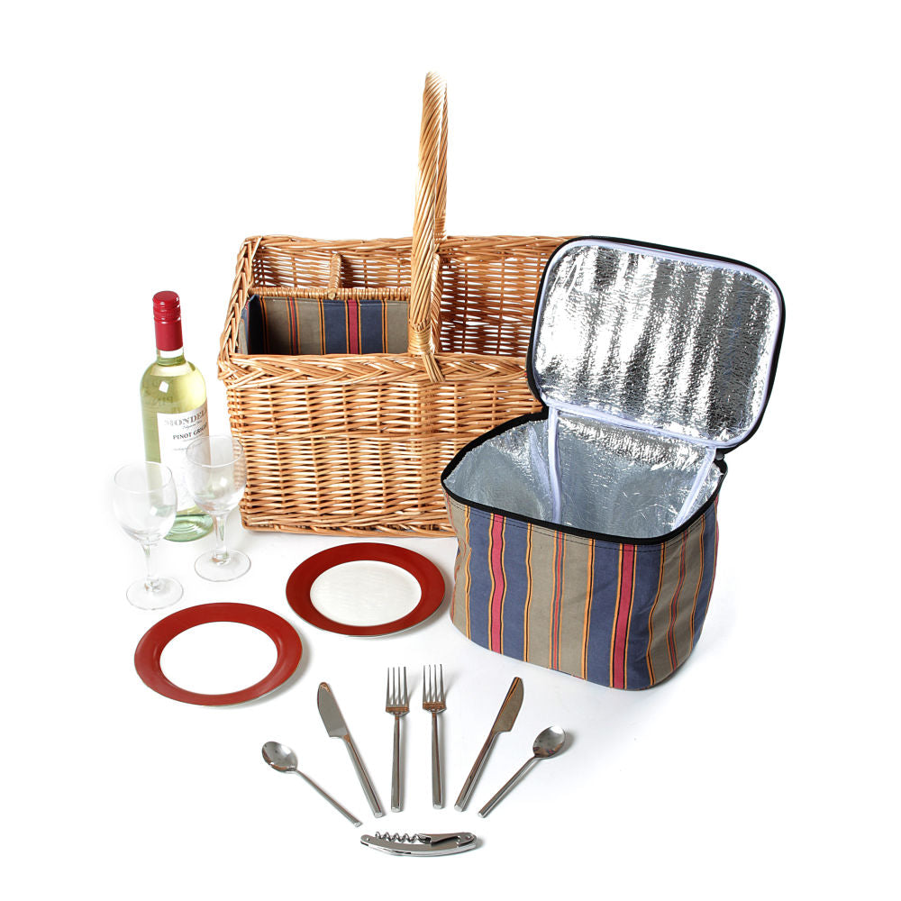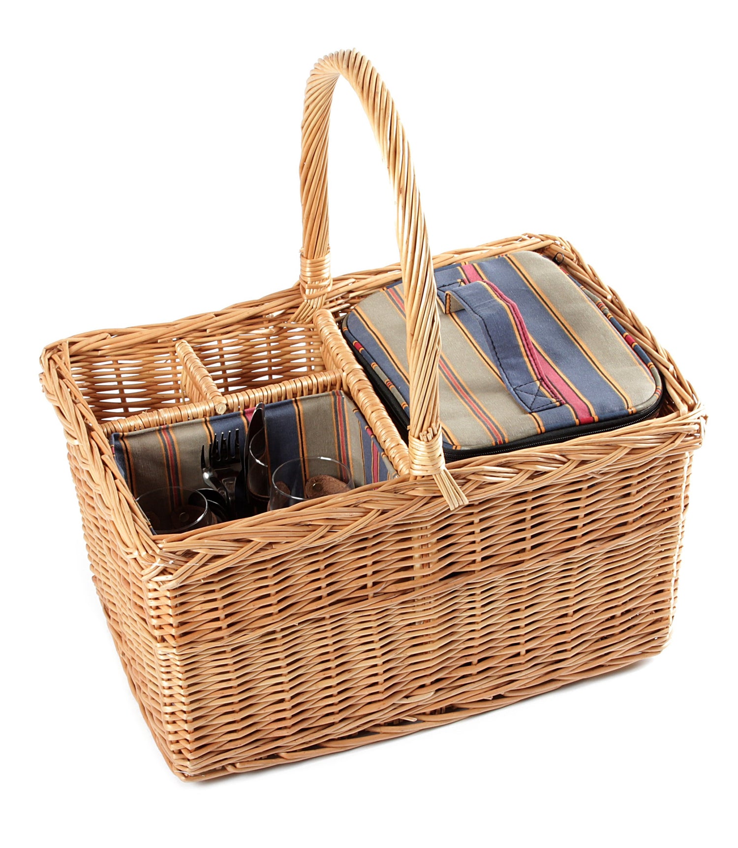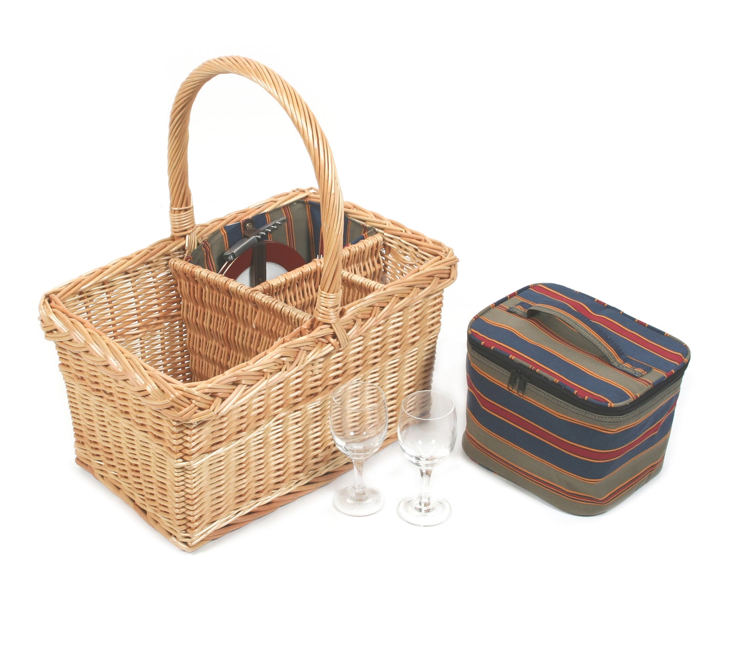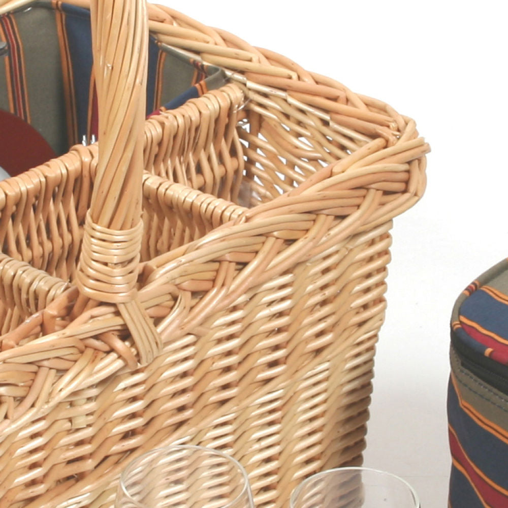 This traditional hamper basket has four compartments; one large, one medium and two bottle compartments ideal for wine or soft drinks. The large compartment perfectly fits the insulated cool bag. The medium compartment houses the fitted accessories. The twisted willow handle feels comfortable and sturdy to carry.