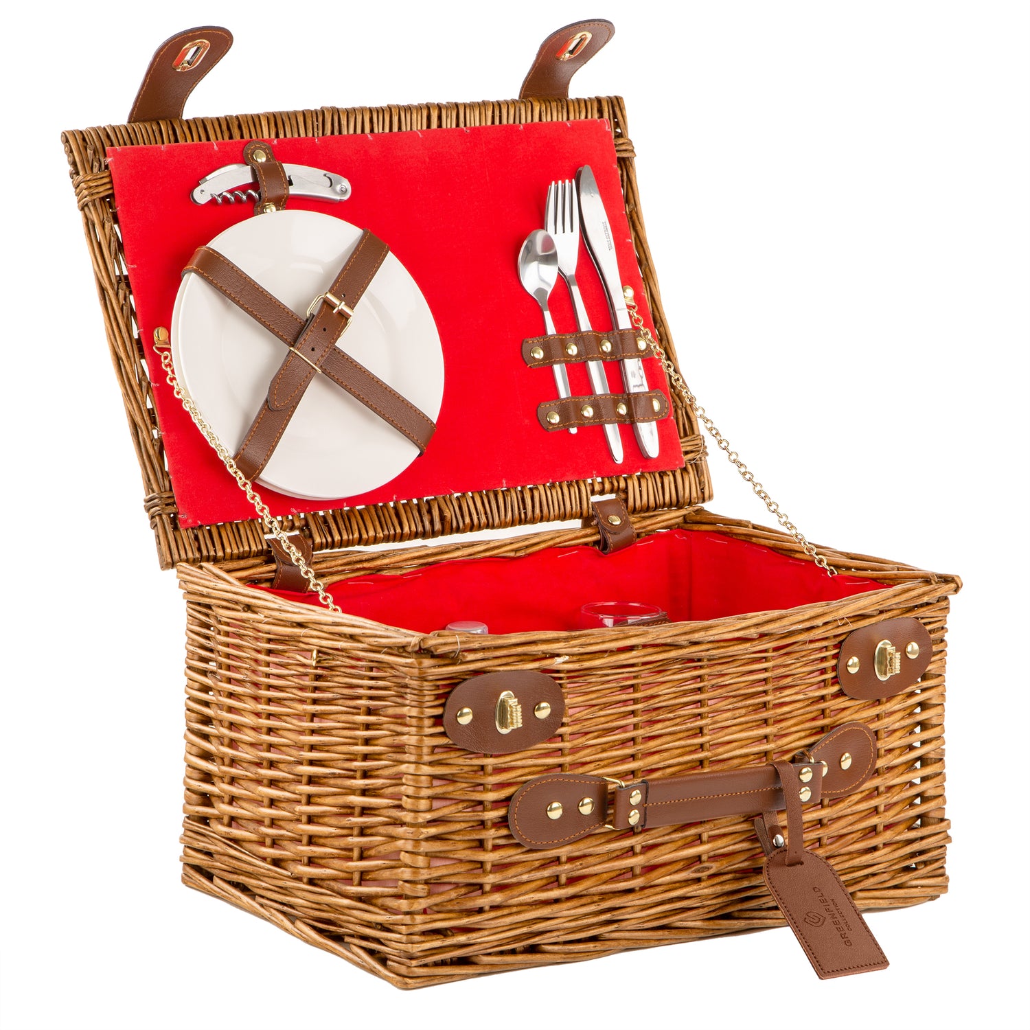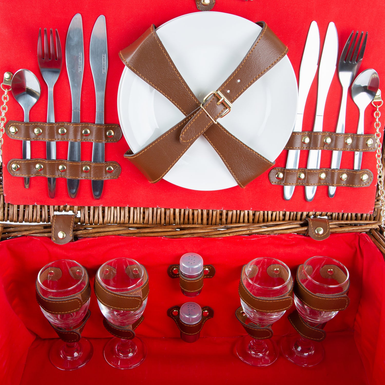 This classic style picnic basket set has all the accessories included inside for a perfect picnic. The beautifully made wicker hamper with a stunning royal red lining gives a truly British feel to any outdoor dining adventure.