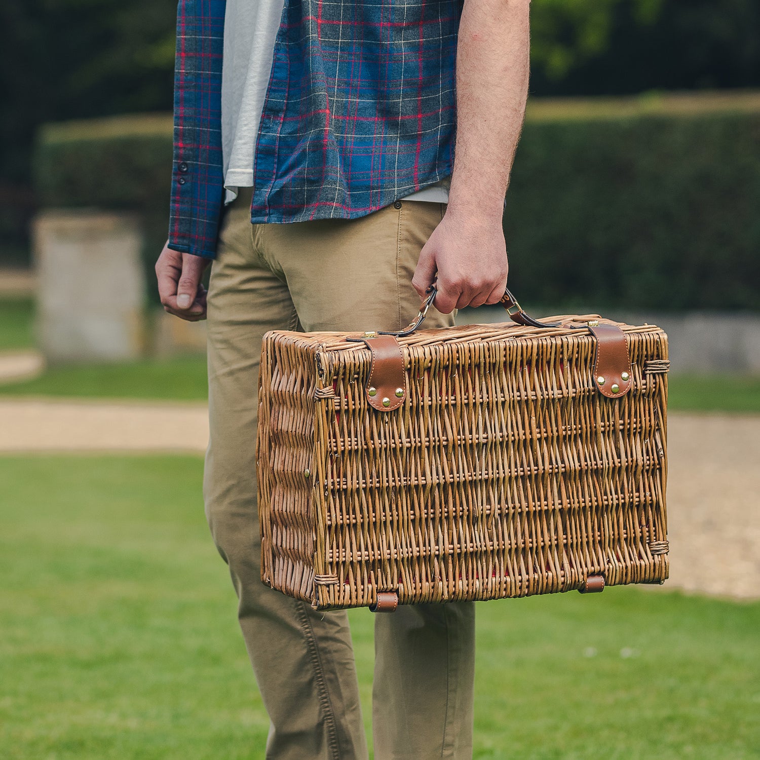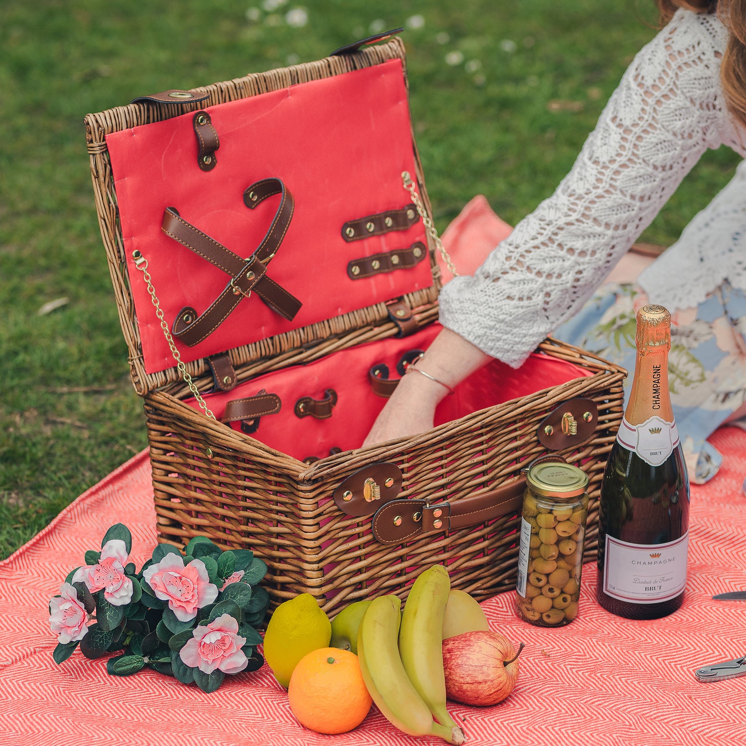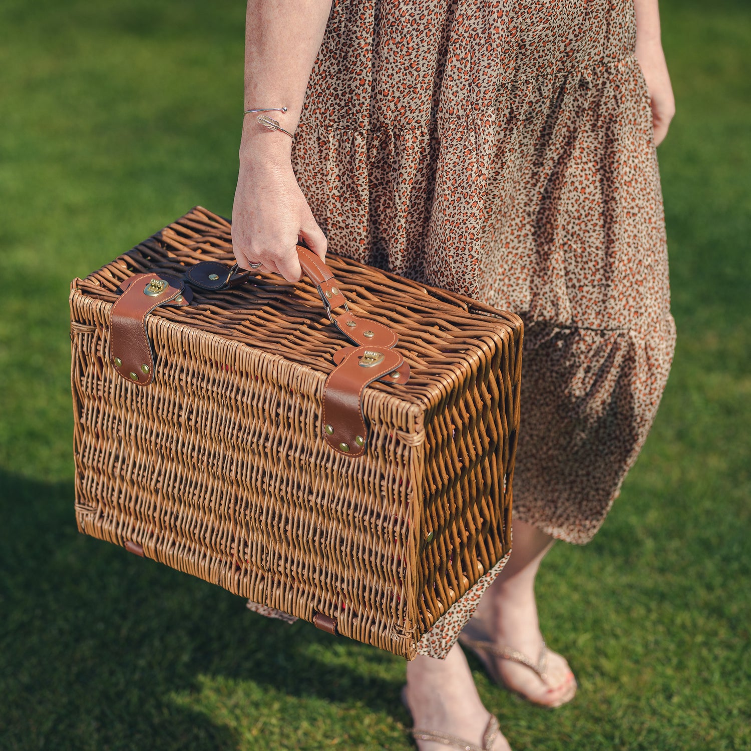 The picnic hamper features tanned faux leather fastenings with gold fixings to close, and a sturdy handle to carry your alfresco feast to the destination.