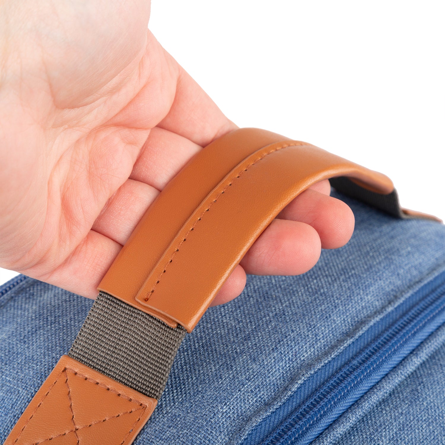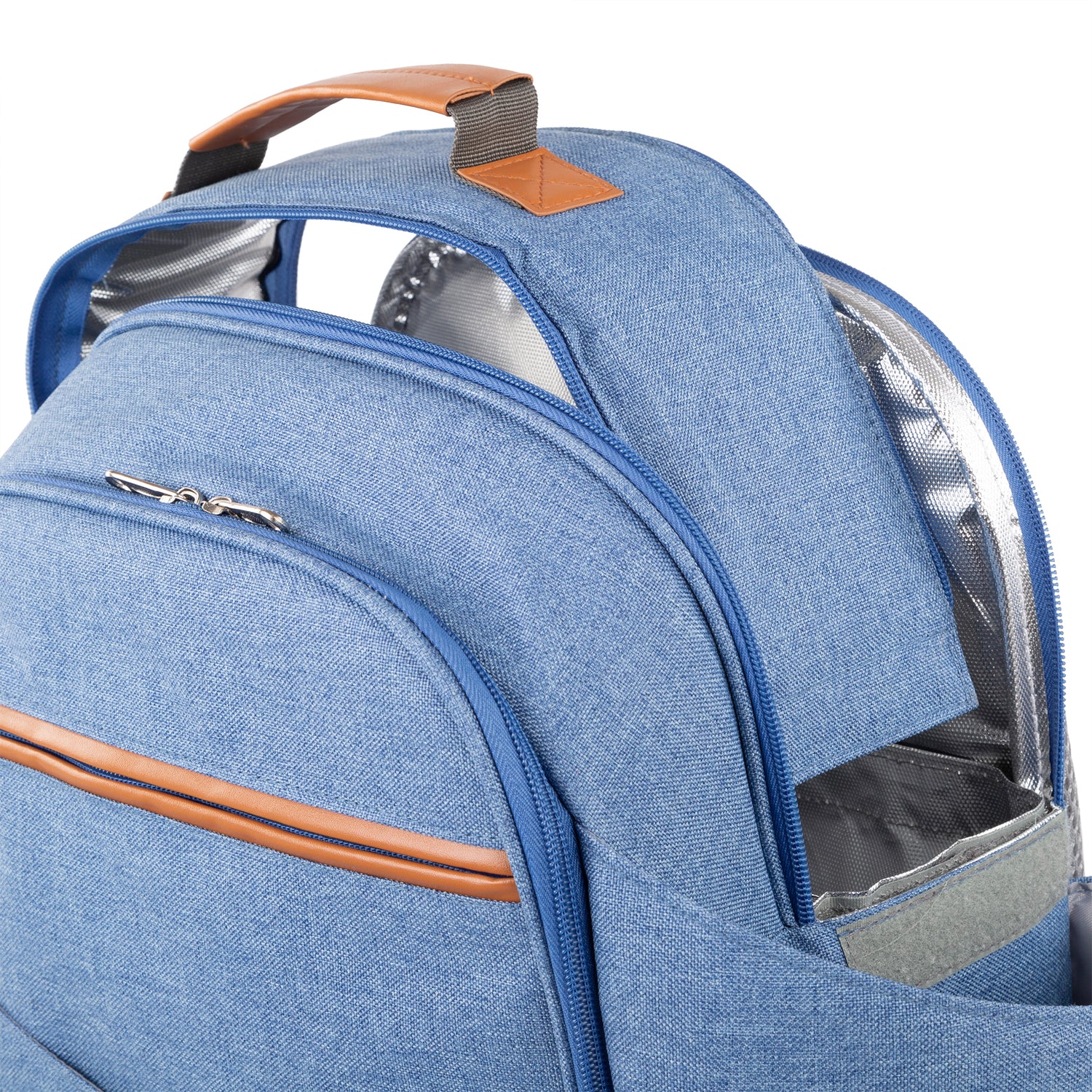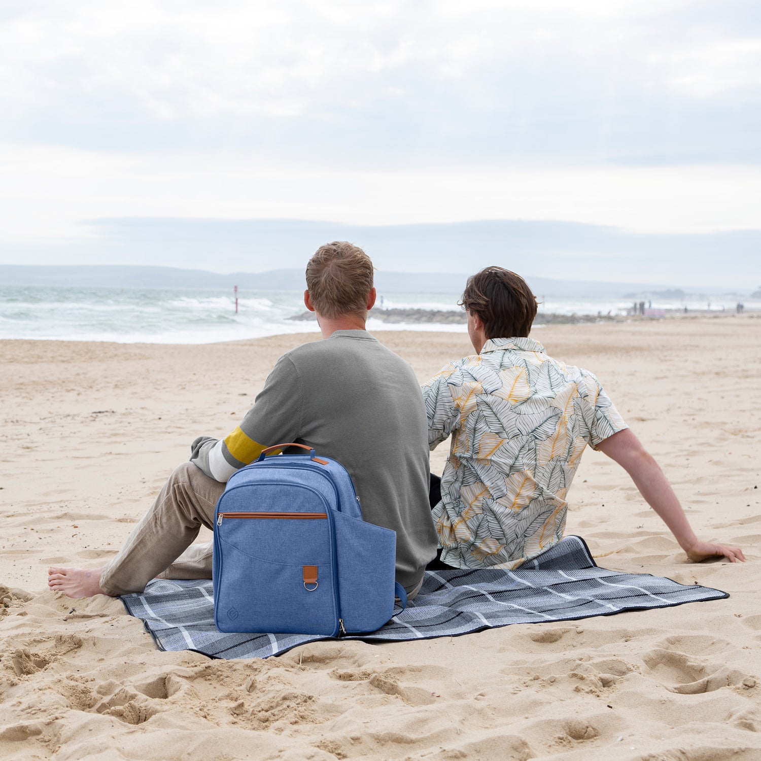 Available in stone grey or denim blue with attractive tan faux leather handles and piping, the picnic backpack is made using strong, durable, and easy to clean materials and includes all the accessories you need to enjoy a picnic for up to two people, including a handy fold up bag to collect your rubbish in.