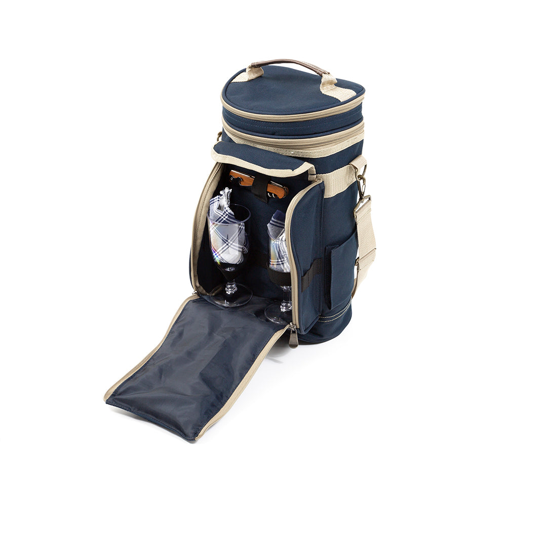This wine cooler bag with fitted accessories can accommodate a combination of a bottle of wine or soft drink and food.